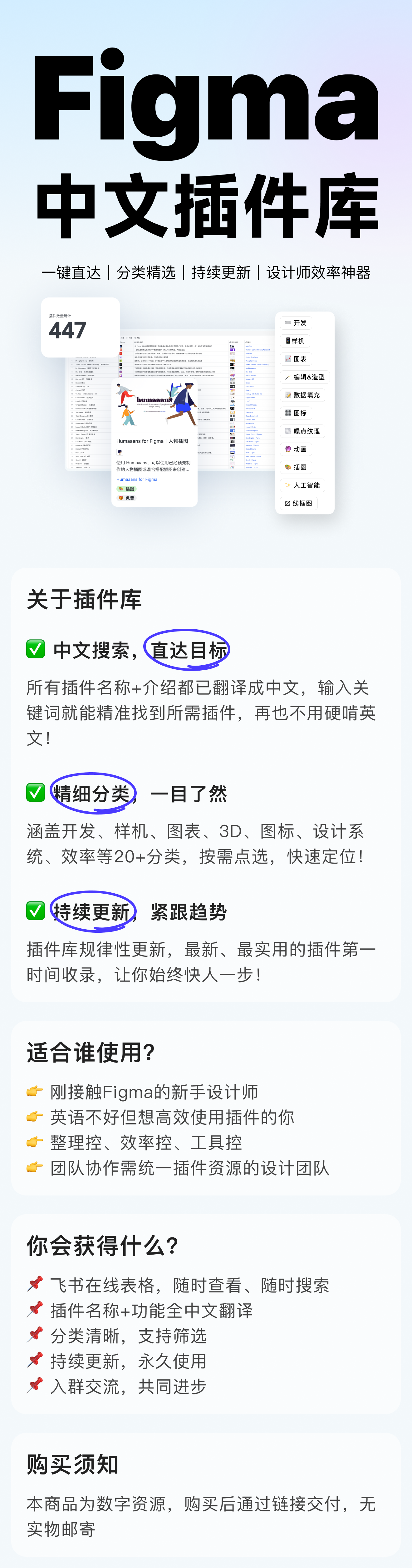 你是不是也遇到过这些烦恼?😣 ❶ 英文不好,Figma官网插件看不懂、搜不到? ❷ 收藏了一堆插件,用的时候却找不到? ❸ 工作急需某个功能,却不知道用什么插件? 别担心!我为你整理了👉【Figma中文插件库】,帮你彻底告别搜索困难症! ✅ 中文搜索,直达目标 所有插件名称+介绍都已翻译成中文,输入关键词就能精准找到所需插件,再也不用硬啃英文! ✅ 精细分类,一目了然 涵盖开发、样机、图表、3D、图标、设计系统、字体等15+实用分类,按需点选,快速定位! ✅ 持续更新,紧跟趋势 插件库每日更新,最新、最实用的插件第一时间收录,让你始终快人一步! 适合谁用? 👉 刚接触Figma的新手设计师 👉 英语不好但想高效使用插件的你 👉 整理控、效率控、工具控 👉 团队协作需统一插件资源的设计团队 你会获得什么? 📌 飞书在线表格,随时查看、随时搜索 📌 插件名称+功能全中文翻译 📌 分类清晰,支持筛选 📌 持续更新,永久使用 📌 入群交流,共同进步